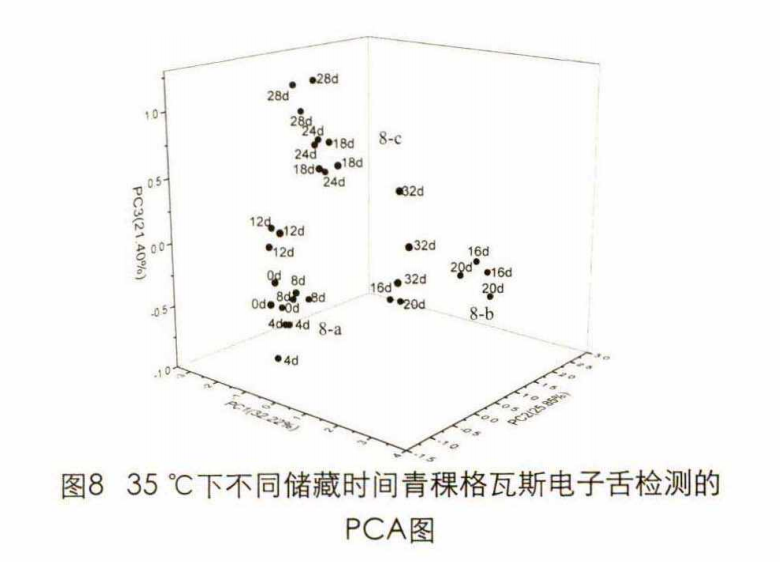 由圖8可知:當(dāng)儲(chǔ)藏溫度為35 °C時(shí) ,第一、二、三主成分的貢獻(xiàn)度分別為32.22%、25.85%、21.40%,總貢獻(xiàn)率達(dá)79.47%,基本上解釋了樣品的大部分信息。在三維圖譜上可以看出,隨著儲(chǔ)藏時(shí)間的延長(zhǎng),樣品延PC1、PC2構(gòu)成的底面從左至右開始分布,延PC3軸先向下后向上開始分布。在儲(chǔ)藏時(shí)間32 d內(nèi),隨著滋味的變化樣品在PCA三維圖譜上形成了3個(gè)分布界限較為明顯的區(qū)域 ,8-a、8-b、8-c , 儲(chǔ)藏時(shí)間分界線分別是 12 d、16?20 d、 18 ? 24 d。