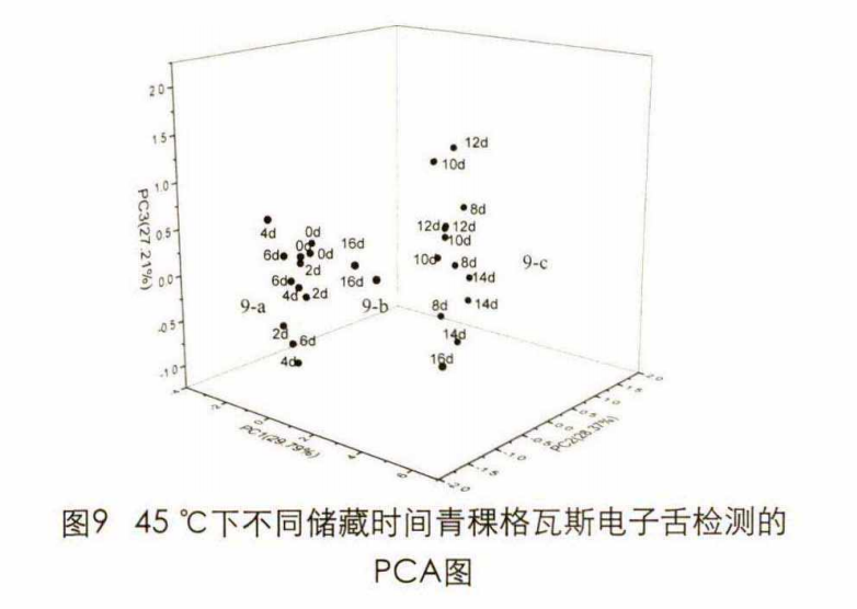 由圖9可知:在溫度為 45°C時(shí) ,第 一 、二 、三 主 成 分 的 貢獻(xiàn)度分別為 29.79 % 、28.37 % 、27.21 % ,總貢獻(xiàn)率達(dá)85.37%, PCA三維圖譜基本上反映樣品的大部分信息。由圖9可知,樣品基本上延PC3軸向上分布,形成9-a、9-b、9-c 3個(gè)分界明顯的區(qū)域。6 d前各點(diǎn)分布緊密,形成區(qū)域9-a;6 d后隨著儲(chǔ)藏時(shí)間的延長(zhǎng)樣品在PCA三維圖譜上的分布較區(qū)域9-a較遠(yuǎn),且各自分布松散,可能是由于儲(chǔ)藏時(shí)間較長(zhǎng),導(dǎo)致滋味呈無規(guī)律變化。從滋味角度可以反映出儲(chǔ)藏于45 °C ,青稞格瓦斯的貨架期為6 d。