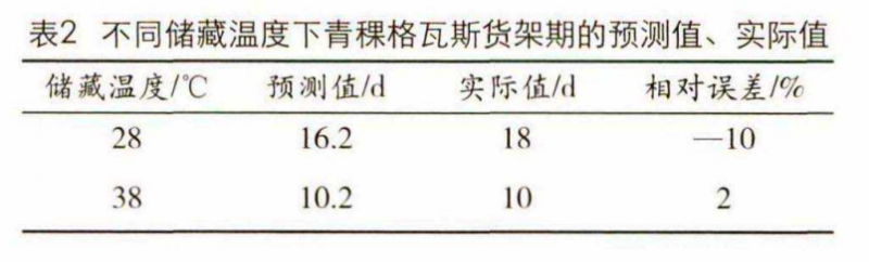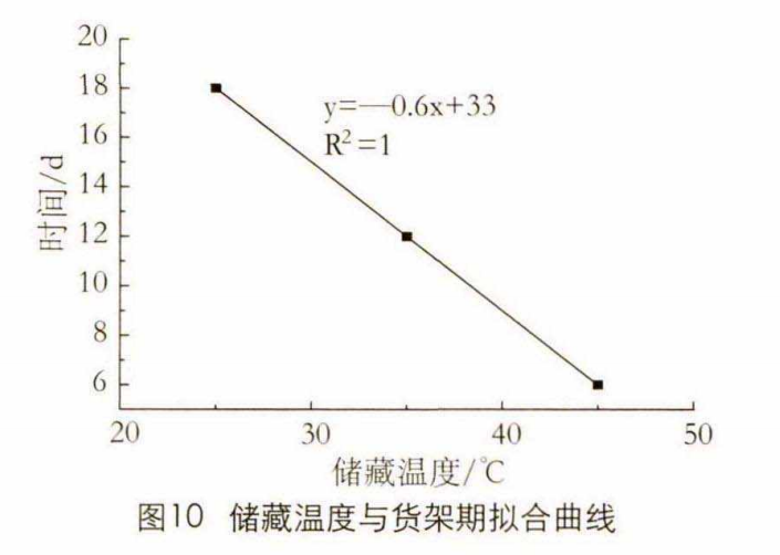 Q10值為溫度相差10 °C時(shí)食品的貨架期之比,該值用來確定溫度對(duì)反應(yīng)的敏感程度,大多數(shù)據(jù)為2。由表1可知,3種溫度下青棵格瓦斯的貨架期數(shù)據(jù),計(jì)算得Q10為 1.5?2.0,平均值為 1.75。應(yīng)用Origin軟件對(duì)貨架期Y和溫度X的關(guān)系進(jìn)行曲線擬合,發(fā)現(xiàn)Y與X的關(guān)系最符合一次函數(shù),擬合方程為Y=-0.6X+33, R2=1。為驗(yàn)證模型的準(zhǔn)確性 ,實(shí)驗(yàn)選取28、38 °C儲(chǔ)藏,所得格瓦斯的貨架期分別為 18、10 d, 模型預(yù)測(cè)值為16.2、10.2 d,預(yù)測(cè)值的相對(duì)誤差率在-1 0 %?2 % , 誤差較小,說明此模型可快速地對(duì)青棵格瓦斯貨架期進(jìn)項(xiàng)初步預(yù)測(cè)。