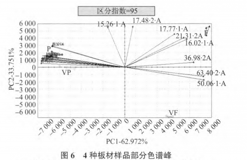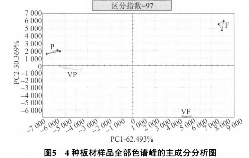 通過篩選峰面積較大(峰面積>l ooo)及樣品分較為明顯(區(qū)別能力>0.9)色譜峰優(yōu)化試驗結(jié)果見圖6,且標(biāo)注出貢獻區(qū)分的主要色譜峰。圖5與圖6無明顯差異,4種樣品分布趨勢相同,刨花板與貼面刨花板距離較為接近,纖維板與貼面纖維板的距離較遠。