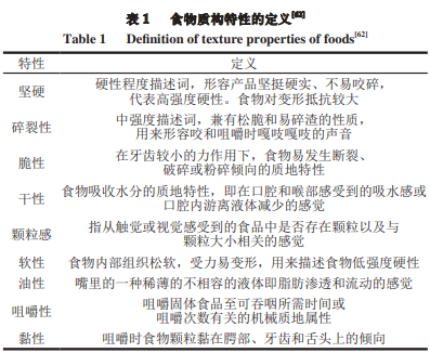 質(zhì)構(gòu)是重要的感官屬性,堅(jiān)果類食物具有含水量低、質(zhì)地硬脆等特點(diǎn),與其種類、大小、類型密切相關(guān),如堅(jiān)果的類型對(duì)其斷裂力有顯著影響,天然堅(jiān)果較烘烤堅(jiān)果具有更大的斷裂力和更高的硬度;由于堅(jiān)果形狀的不規(guī)則性,其具有不同的加載方向,斷裂力隨堅(jiān)果尺寸的減小而減小,表明較大的堅(jiān)果可能比較小的堅(jiān)果需要更大的力來(lái)破碎。因此,每個(gè)堅(jiān)果的質(zhì)地都是獨(dú)一無(wú)二的,在口腔加工的不同階段,其破碎行為和風(fēng)味的釋放有所不同,同時(shí)因消費(fèi)者個(gè)體的口腔生理差異也導(dǎo)致堅(jiān)果類食物口腔加工過(guò)程中風(fēng)味感知的多樣性。咀嚼期間,伴隨堅(jiān)果破碎以及唾液的釋放,堅(jiān)果發(fā)生一系列幾何性質(zhì)、質(zhì)構(gòu)性質(zhì)以及物理化學(xué)性質(zhì)的改變,消費(fèi)者逐漸感知到硬度、碎裂性、咀嚼性、黏性等質(zhì)地特性的變化,以及堅(jiān)果的香氣。常見(jiàn)的質(zhì)構(gòu)特性如表1所示。