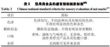 堅(jiān)果的感官品質(zhì)是影響其質(zhì)量的重要指標(biāo)。目前,如表2所示,通常采用GB/T22165—2008《堅(jiān)果炒貨食品通則》對(duì)堅(jiān)果類食品的色澤、顆粒形態(tài)、口味、雜質(zhì)進(jìn)行較為籠統(tǒng)的評(píng)價(jià),不利于堅(jiān)果類食品行業(yè)整體質(zhì)量的提高,因此,堅(jiān)果類食物的感官評(píng)價(jià)方法可從以下方面進(jìn)行補(bǔ)充。