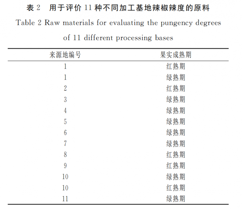 采用9種已知辣度的辣椒紅果果實(shí),建立應(yīng)用電子鼻評(píng)價(jià)加工型辣椒果實(shí)辣度的方法,見(jiàn)表1;應(yīng)用所建立的辣度評(píng)價(jià)方法分別檢測(cè)11種辣椒紅果及辣椒綠果,檢測(cè)的11個(gè)辣椒加工基地的原料見(jiàn)表2。將試驗(yàn)材料于常溫、避光保存,待測(cè)定。