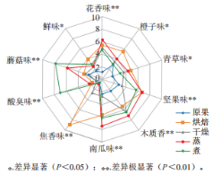 10種描述詞被選取用于5種處理后沙棗的感官評價(jià):花香、橙子味、青草味、堅(jiān)果味、木質(zhì)香、南瓜味、焦香味、酸臭味、蘑菇味、鮮味,根據(jù)描述繪制風(fēng)味輪廓圖,結(jié)果如圖3所示。不同方式預(yù)處理后的沙棗在所有感官屬性上的香氣強(qiáng)度均存在顯著差異(0.01<P<0.05),其中花香味、堅(jiān)果味、木質(zhì)香、南瓜味、焦香味、酸臭味和蘑菇味這幾種感官屬性存在極顯著差異(P<0.01)。