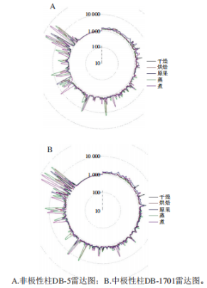 快速氣相色譜型電子產(chǎn)品鼻是基于仿生學(xué)原理,由傳感器傳感器陣列和模式識別系統(tǒng)組成,是一種新型電子分析儀器,其采用2根極性差異的色譜柱DB-5和DB-1701對氣味實(shí)現(xiàn)快速識別與解析,具備直觀簡便、重復(fù)性好等優(yōu)勢,結(jié)果見圖4。原果和干燥處理后的樣品總體出峰情況比較相似,烘焙和蒸、煮處理后的樣品在各個(gè)出峰部位的峰面積顯然放大,說明各種香氣物質(zhì)濃度含量及其總體香氣強(qiáng)度增加,與原果及干燥處理后相比具有一定差異。