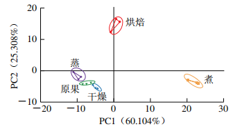 主成分分析(PCA)不僅能降低原始數(shù)據(jù)的維度還可以保留分開樣本的可變性。由圖5可知,PC1、PC2的貢獻(xiàn)率分別為60.1%和25.3%,累計(jì)方差貢獻(xiàn)率為85.4%(>85%),表明其可以有效反映原始數(shù)據(jù)的整體信息。烘焙和煮處理后的沙棗樣品位于PC1的負(fù)半軸,表明這烘焙、煮2類處理方式在PC1上差異明顯。原果、蒸、干燥處理后沙棗樣品在正半軸PC2上,烘焙和其他處理的沙棗樣品得到了較好的分離,其他4種處理方式位置區(qū)域接近,結(jié)果表明這4種預(yù)處理方式相互之間或許具有一些的相似之處。各樣品組別相互離散、無交叉,說明PCA能夠?qū)⒉煌绞筋A(yù)處理后的沙棗有效的區(qū)分開。因此,可以得出各個(gè)樣品組之間可通過電子鼻區(qū)分開并相互獨(dú)立,不同處理方式可以在不同程度上改變其沙棗的香氣成分。