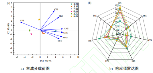 為比較不同烹飪方式對芫根整體滋味的影響,對樣品進行電子舌分析,結(jié)果如圖3所示。電子舌主成分分析中,第一主成分(PC1)和第二主成分(PC2)的貢獻率分別為74.54%和17.44%,總貢獻率達91.98%,已超過85%,說明這兩個主成分涵蓋了絕大多數(shù)樣品信息,可以用來表征芫根的滋味特征。主成分載荷圖中,以散點代表各個樣品,距離越近,表明樣本滋味相似度越高,對主成分貢獻大的影響因子以射線形式表示出來,影響因子越靠近樣品表明對相應(yīng)樣品影響越大。6種芫根樣品分散區(qū)域明顯,表明電子舌能夠較好的區(qū)分不同烹飪方式的芫根。新鮮芫根與其他5種芫根樣品距離較遠,ANS和CTS傳感器對其影響較大,其中CTS傳感器對咸味具有特敏性,結(jié)合圖3b可知,新鮮芫根在ANS和鮮味特敏傳感器NMS上響應(yīng)值較高,在咸味CTS和酸味AHS傳感器上響應(yīng)值次之,烹飪后,鮮味NMS傳感器響應(yīng)值減弱,咸味CTS響應(yīng)值也明顯降低,酸味AHS響應(yīng)值增強,說明烹飪處理會減弱芫根本身的咸鮮味,突出酸味。油炒的芫根整體響應(yīng)值較大,與其他樣品距離較遠,說明油炒的與其他烹飪處理的芫根整體滋味差異較大,一方面是因為油炒溫度較高導(dǎo)致,另一方面食用油也會對芫根滋味產(chǎn)生影響。水煮和氣蒸的芫根在主成分圖中距離較近,說明這兩種方式烹飪的芫根整體滋味相似;同理可得微波和高壓烹飪的芫根滋味相似。