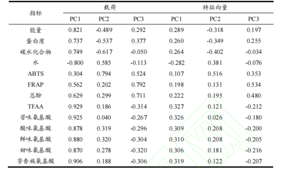 對芫根各品質(zhì)指標(biāo)利用SPSS進行主成分分析,結(jié)果如表3所示,前三個主成分的特征值都大于1,且方差貢獻率累計達到97.119%,因此選用前3個主成分用于綜合評分。3個主成分的載荷矩陣如表4所示,PC1的方差貢獻率為62.034%,反應(yīng)了大部分指標(biāo)的信息,其中總游離氨基酸含量與PC1呈高度正相關(guān),水分含量與PC1呈負(fù)相關(guān);ABTS抗氧化能力與PC2呈高度正相關(guān),F(xiàn)RAP抗氧化能力與PC3呈高度正相關(guān)。