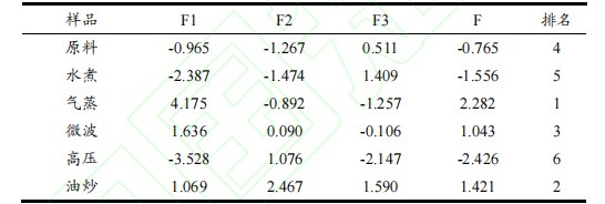 通過計算得到不同烹飪方式的芫根的綜合品質(zhì)得分,得分高低反映芫根品質(zhì)的高低,如表5所示,PC1中得分最高的是氣蒸芫根和油炒芫根,說明PC1對這兩種方式烹飪的芫根品質(zhì)有較大影響;PC2中微波的芫根得分最高,說明ABTS抗氧化能力對其品質(zhì)影響最大;PC3中新鮮芫根得分最高。根據(jù)綜合評分排名情況來看,不同烹飪方式處理后的芫根品質(zhì)存在較大差異,氣蒸芫根綜合得分最高,其次是油炒芫根,高壓芫根得分最低。