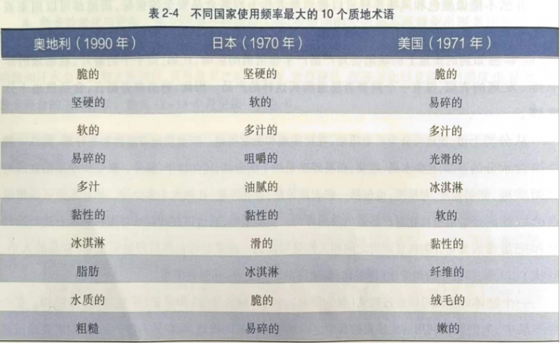 一定的質(zhì)地術(shù)語和感覺可以跨越文化的差異,具有國際性。因此,任何國家、文化或地區(qū)的感官專家應(yīng)當(dāng)不僅僅注意食品可感知到的風(fēng)味、味道和顏色的量值,而且要注意能感知到的質(zhì)地特征。有研究表明:不同國家的質(zhì)地描述詞匯大多數(shù)是相同的,如表2-4所示。