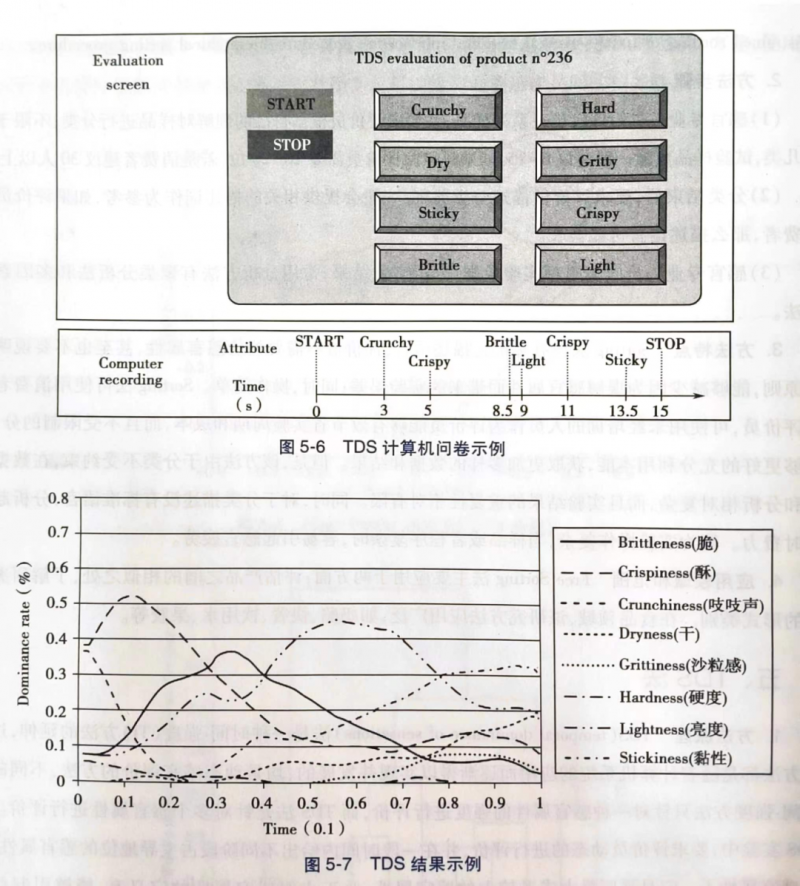 TDS(temporal dominance of sensations)法是一種時間-強(qiáng)度(TI)方法的延伸,這兩種方法都是隨著計算機(jī)系統(tǒng)的應(yīng)用而逐漸得以實(shí)現(xiàn)并發(fā)展的,均是動態(tài)感官評價的方法,不同的是時間-強(qiáng)度方法只針對一種感官屬性的強(qiáng)度進(jìn)行評價,而TDS法是針對多個感官屬性進(jìn)行評價。在TDS 實(shí)驗(yàn)中,要求評價員動態(tài)的進(jìn)行評價,并在一段時間內(nèi)給出不同階段占主導(dǎo)地位的感官屬性,主要感官屬性不一定是強(qiáng)度最大或者較大的感官屬性,關(guān)于主要感官屬性的定義有:能夠引起注意的感官屬性、持續(xù)增加并突然能被感知的感官屬性。感官專業(yè)人員通過分析實(shí)驗(yàn)結(jié)果,從而獲得不同樣品的主要感官屬性描述圖,常見的結(jié)果呈現(xiàn)方式是TDS曲線。問題和結(jié)果示意圖見圖5-6、圖5-7。