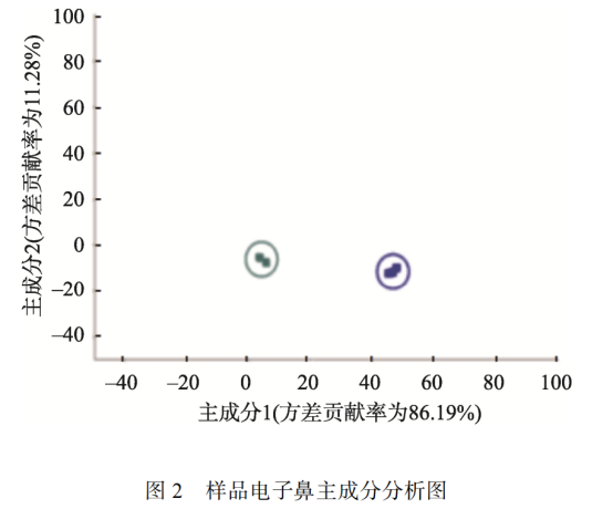 采用主成分分析法(PCA)評價海參肽酶解液與海參肽飲品的揮發(fā)性特征。由圖 2 可知, 主成分 1 的方差貢獻率為 86.19%, 主成分2 的方差貢獻率為 11.28%, 兩成分的總貢獻率為97.47% (>85%), 說明這 2 個主成分可以反映樣品香氣的整體信息。樣品在第一主成分上的距離越大, 則差異越大。由圖 2 可以看出, 2 種樣品在第一主成分上距離較大, 說明2 種樣品間的氣味成分差異較大, 產(chǎn)生這種現(xiàn)象的原因可能是添加輔料中的成分所起的作用。本研究選用 140 s 時各傳感器穩(wěn)態(tài)響應(yīng)值作為分析點建立雷達(dá)圖, 各傳感器響應(yīng)值越高表明相對應(yīng)的該類物質(zhì)含量越高。如圖3 所示, W5S、W6S、W5C、W2S、W2W 和 W3S 傳感器對海參肽飲品的香氣敏感, 表明氮氧化物、氫化物、烷烴、醇類、硫化氫類、芳香烷烴這些物質(zhì)在海參肽飲品中含量較高。