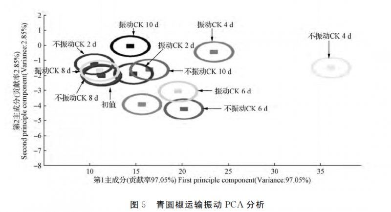 如圖5所 示,為運輸振動 CK 和不振動 CK青圓椒的 PCA 分析圖(A 組),2組的尖椒主成分1的貢獻率 為 97.05%,主成分 2 的貢獻率為2.85%,總貢獻率 為99.90%。表明2個主成分已經(jīng)基本代表了樣品的主要信息特征,電子鼻能夠?qū)悠泛唾A藏時間加以區(qū)分。從 圖5可以看出,青圓椒的振動 CK 和不振動 CK10d內(nèi)的揮發(fā)性物質(zhì)成分區(qū)域較為接近,且不同貯藏時間內(nèi)揮發(fā)性物質(zhì)成分區(qū)域有重疊,說明振動組和不振動組貯藏10d內(nèi)的青圓椒果實揮發(fā)性物質(zhì)變化不大,在貯藏期內(nèi),運輸振動和不振動對青圓椒的氣味影響不大,均可保持青圓椒的香氣。
