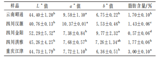 采用全自動色差儀測量魚片表面的顏色,每次測試前進行校準。測量白度(L*值)、紅度(a*值)和黃度(b*值)。不同產地的青花椒對花椒魚片的色澤和脂肪含量的影響不同,結果見表2。
