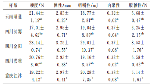 采用質構儀測定硬度、彈性、咀嚼性、內聚性、膠黏性5個指標,判斷魚肉質構的變化。不同產地的青花椒對花椒魚片質構特性的影響不同,結果見表3。