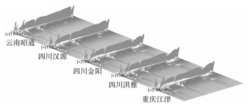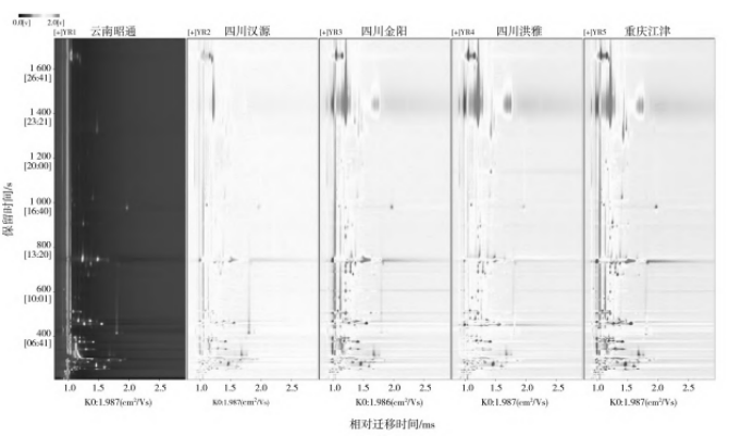 青花椒產地對花椒魚片風味物質的影響花椒魚片樣品的揮發(fā)性物質GC-IMS三維圖譜見圖2。圖2中每個反應離子峰代表一種揮發(fā)性風味物質,顏色越深,表示物質越豐富。使用不同產地的青花椒制作花椒魚片時,可以直觀地看到四川金陽和重慶江津樣品組中風味物質的種類和濃度與其他樣品組差異較明顯?;ń肤~片特征性風味成分GC-IMS差異譜圖見圖3,此圖是將圖2的三維圖投影到二維平面上的俯視圖,具體是以氣相色譜的保留時間作為縱坐標,以離子遷移時間作為橫坐標,以云南昭通青花椒樣品組譜圖為參比,將另外4個樣品組的譜圖扣減參比后得到的。差異圖譜中每個點代表一種揮發(fā)性風味物質。結果顯示,與云南昭通樣品組相比,四川金陽和重慶江津樣品組的風味物質濃度較高。