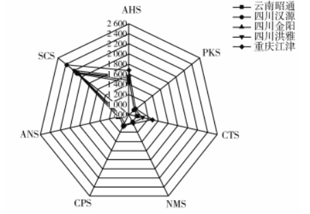 利用電子舌檢測儀自帶軟件對花椒魚片樣品的數(shù)據(jù)進行主成分分析(PCA),結果見圖5。主成分1和主成分2的貢獻率分別為94.356%和5.388%,總貢獻率達99.744%,超過85%,表明這兩個主成分涵蓋了大多數(shù)樣品信息,可以用來表征花椒魚片樣品的滋味特征。5種樣品散點區(qū)域分散明顯,表明電子舌能夠較好地區(qū)分不同產地的花椒魚片。由圖5可知,重慶江津樣品組與其他4組樣品的滋味差異最大。由圖6可知,花椒魚片在傳感器SCS、AHS、CTS、NMS上響應值較高,其中AHS、CTS、NMS分別為酸味、咸味、鮮味專一性傳感器,SCS為非專一性傳感器。差異性最大的SCS傳感器可能和青花椒中麻味物質含量的高低有關,其中重慶江津樣品組的響應值最大。