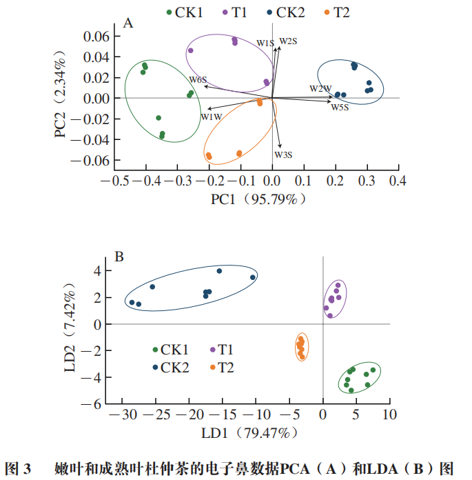 參考文獻(xiàn):周昀菲,孫志強(qiáng),杜慶鑫,等.基于電子鼻和HS-SPME-GC-MS分析蒸汽爆破對(duì)杜仲嫩葉和成熟葉茶香氣特征的影響[J].食品科學(xué),2024,45(01):91-100.
