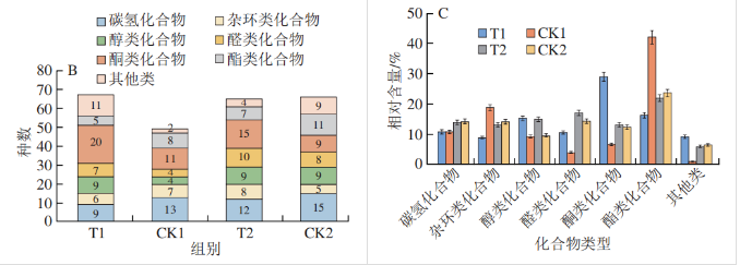 為探究嫩葉和熟葉杜仲茶汽爆前后制成杜仲茶的香氣特征差異,利用HS-SPME-GC-MS聯(lián)用對(duì)4 種處理杜仲茶的揮發(fā)性化合物成分和相對(duì)含量進(jìn)行分析鑒定,得到其總離子流圖(圖4),共檢測(cè)到177 種揮發(fā)性物質(zhì),其中,CK1、T1、CK2和T2中可鑒定的峰面積分別占比92.32%、100.00%、94.50%和100.00%。根據(jù)化合物類型將其分為碳?xì)浠衔?、雜環(huán)類化合物、醇類化合物、醛類化合物、酮類化合物、酯類化合物和其他類化合物。由圖5A可知,CK1、T1、CK2和T2 4 個(gè)處理所制的杜仲茶揮發(fā)性化合物種數(shù)差異顯著,數(shù)量排序?yàn)門1>CK2>T2>CK1,汽爆處理后的成熟葉茶揮發(fā)性化合物種類高于未汽爆處理,增加了16 種,而嫩葉茶汽爆前后揮發(fā)性化合物種類無顯著差異。其中,嫩葉茶汽爆后醛類、酮類和雜環(huán)類分別增加了2、6 種和3 種,成熟葉茶汽爆后醇類、醛類和酮類分別增加了5、3 種和9 種(圖5B)。CK1、T1、CK2和T2 4 種杜仲茶揮發(fā)性化合物相對(duì)含量的差異也十分顯著,酯類是相對(duì)含量最高的化合物類型,相對(duì)含量分別為42.07%、16.33%、23.70%和21.89%;酮類相對(duì)含量分別為6.63%、29.05%、12.30%和13.15%;碳?xì)漕惖南鄬?duì)含量分別為10.76%、10.83%、14.20%和13.89%;醇類的相對(duì)含量分別為9.27%、15.22%、9.48%和14.87%;雜環(huán)類的相對(duì)含量分別為18.73%、8.83%、14.13%和13.13%;其他類的相對(duì)含量分別為0.90%、8.68%、5.25%和4.92%(圖5C)。