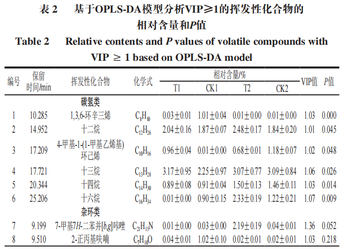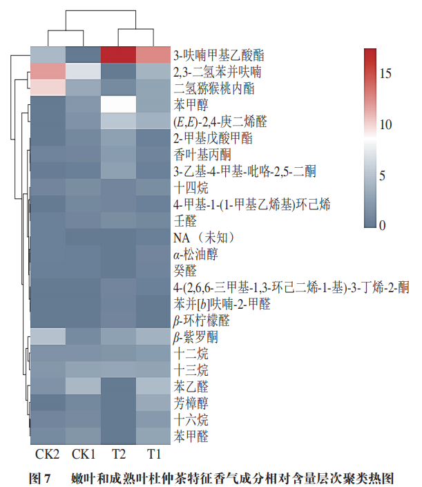 為進(jìn)一步縮小特征香氣化合物范圍,從VIP≥1的揮發(fā)性化合物中,篩選出差異代謝物達(dá)到顯著水平(即P<0.05)的揮發(fā)性化合物,得到24 種特征香氣化合物,對(duì)應(yīng)的層次聚類熱圖如圖7所示,其中,CK2中相對(duì)含量最高的是醛類和雜環(huán)類,CK1、T1和T2中相對(duì)含量最高的是酯類。T2和T1中相對(duì)含量增加最顯著的均是酯類和酮類,分別增加了13.06%和4.12%、9.71%和4.84%。