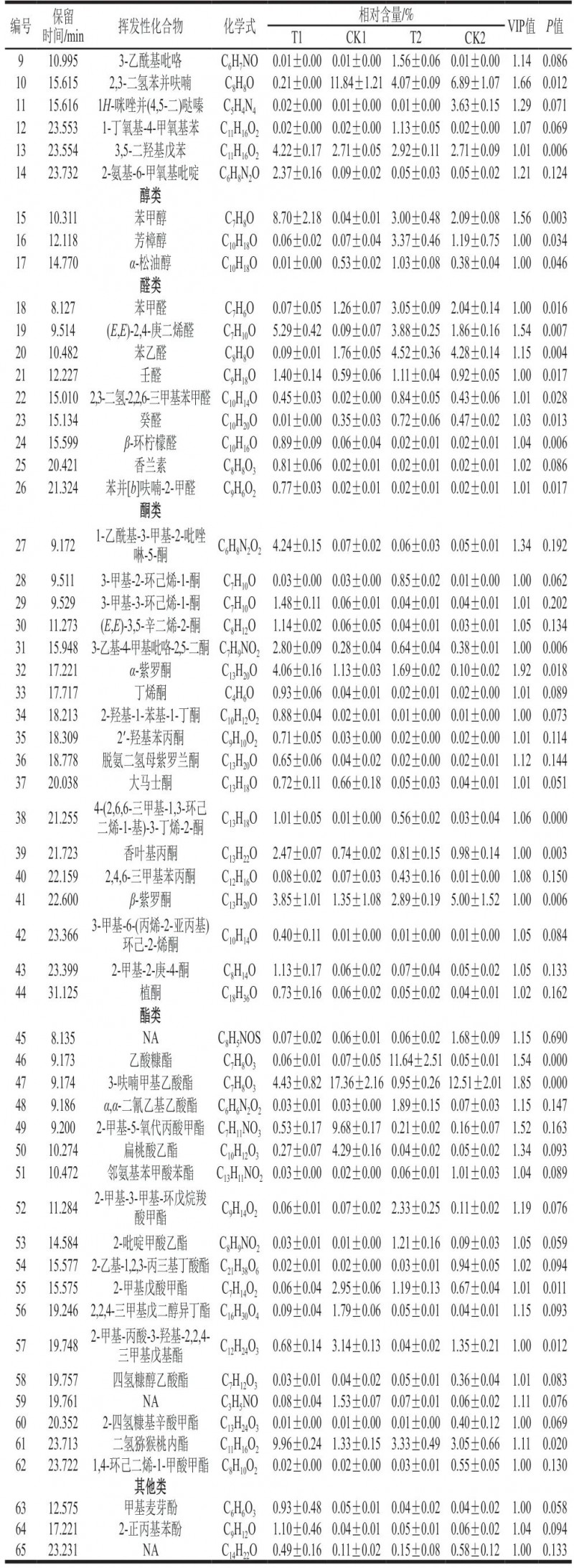 如表2所示,VIP≥1的揮發(fā)性化合物共有65 種。其中,酯類物質(zhì)主要為二氫獼猴桃內(nèi)酯、3-呋喃甲基乙酸酯和2-甲基戊酸甲酯,酮類物質(zhì)主要為大馬士酮、香葉基丙酮、β-紫羅酮、3-乙基-4-甲基吡咯-2,5-二酮和4-(2,6,6-三甲基-1,3-環(huán)己二烯-1-基)-3-丁烯-2-酮,碳?xì)漕愇镔|(zhì)主要為十二烷、十三烷、十四烷、十六烷和4-甲基-1-(1-甲基乙烯基)環(huán)己烯,醇類物質(zhì)主要為苯甲醇、α-松油醇和芳樟醇。