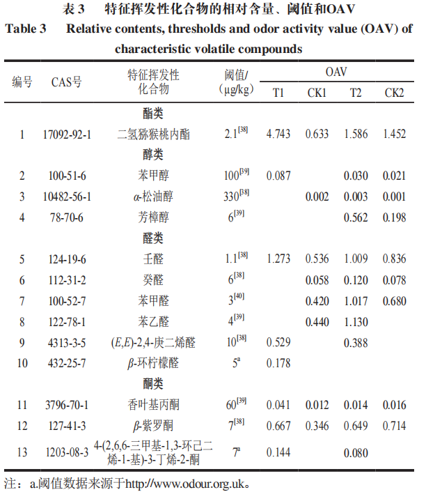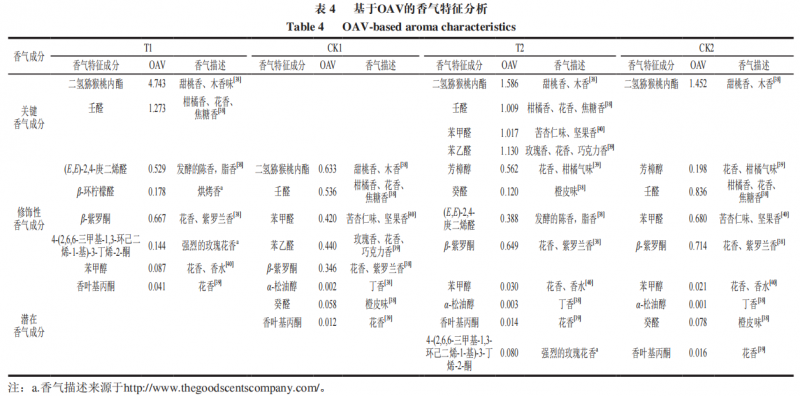 基于OAV的香氣特征分析如表4所示,當(dāng)OAV>1時(shí),定義為關(guān)鍵香氣成分,該香氣成分對(duì)總體香氣有直接影響;當(dāng)0.1<OAV≤1時(shí),定義為修飾性香氣成分,該香氣成分對(duì)總體香氣有輔助影響;當(dāng)0<OAV≤0.1時(shí),定義為潛在香氣成分,該香氣成分對(duì)總體香氣有潛在影響。在一定范圍內(nèi),OAV越大說明該香氣成分對(duì)總體風(fēng)味貢獻(xiàn)越大。T1的關(guān)鍵香氣組分(OAV>1)為二氫獼猴桃內(nèi)酯和壬醛,呈現(xiàn)甜桃香、木香、柑橘香、花香、焦糖香,CK2為二氫獼猴桃內(nèi)酯,呈現(xiàn)甜桃香、木香,T2為二氫獼猴桃內(nèi)酯、壬醛、苯甲醛和苯乙醛,呈現(xiàn)甜桃香、木香、柑橘香、花香、焦糖香、苦杏仁味、堅(jiān)果香、玫瑰香、巧克力香。二氫獼猴桃內(nèi)酯在T1、T2和CK2 3 種茶樣香氣中均占主導(dǎo)地位,其OAV以T1最高,為4.743,其次是T2為1.586。