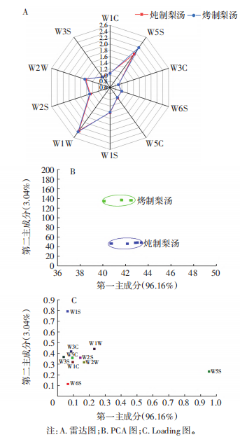 由圖1A可知,兩種梨湯在10種傳感器上的響應各異,在W5S、W1W和W2W傳感器上的響應值較大。由圖1B的PCA結果顯示,第一主成分(PC1)和第二主成分(PC2)的貢獻率分別為96.16%和3.04%,總貢獻率為99.20%,充分涵蓋了兩種梨湯樣品的主要信息,燉制梨湯和烤制梨湯能夠完全分離,說明其氣味具有明顯差異。Loading分析可用于判斷各傳感器對樣品的區(qū)分能力,各傳感器在某主成分軸上的特征向量絕對值越大,表示該傳感器對此主成分的貢獻率越大。由圖1C可知,傳感器W5S對樣品區(qū)分能力最佳,其次為W1W、W2W、W1S和W2S,其中W5S對第一主成分貢獻率最大,W1S對第二主成分貢獻率最大。