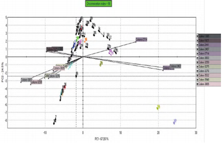 經(jīng)過(guò)篩選重要顏色頻譜進(jìn)行PCA分析,樣品間的區(qū)分指數(shù)為98,說(shuō)明45批大米在色澤上存在著一定的差異,電子眼能夠區(qū)分開(kāi)不同的大米樣品。第一主成分軸(PC1)占67.261%,第二主成分軸(PC2)占24.5%。說(shuō)明主要差異集中在橫軸上,即在橫軸上距離越遠(yuǎn),差異越大。樣品17,18在右下角,游離在其他樣品之外,說(shuō)明與其他樣本在色澤上的差異較大。樣品3和樣品7分布在相近的區(qū)域,樣品2、8、13、15、36、37、40處在相近區(qū)域,其他剩余樣本集中在相近區(qū)域。主成分分析能顯示出45個(gè)樣本間所有的差異。(如圖1所示)