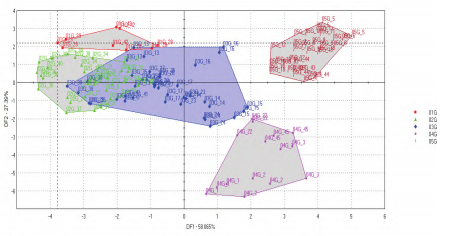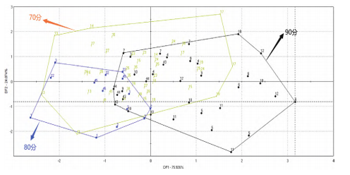 優(yōu)質(zhì)一二三級(jí)粳米對(duì)應(yīng)的品嘗評(píng)分值為90/80/70,單獨(dú)選擇優(yōu)質(zhì)一二三級(jí)樣品,并運(yùn)行DFA模型。模型圖(如圖8所示)中有部分區(qū)域重疊,說(shuō)明優(yōu)質(zhì)粳米間的滋味區(qū)分不明顯。其次是國(guó)標(biāo)中的品嘗評(píng)分值是結(jié)合了氣味/外觀結(jié)構(gòu)/適口性/滋味/冷飯質(zhì)地得到的綜合結(jié)果,數(shù)據(jù)的對(duì)應(yīng)上有所偏差。