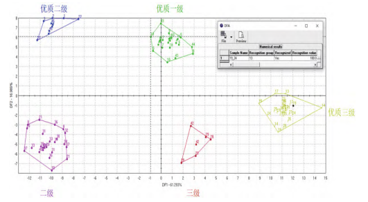 將稻米樣品按不同級(jí)別進(jìn)行分組,二級(jí)-8、三級(jí)-28、優(yōu)質(zhì)一級(jí)-4、優(yōu)質(zhì)二級(jí)-1、優(yōu)質(zhì)三級(jí)-13,運(yùn)行DFA模型。不同級(jí)別的樣品可清晰地區(qū)分開(kāi)來(lái),將樣品19的一個(gè)平行樣用此模型進(jìn)行識(shí)別,其被群組13-優(yōu)質(zhì)三級(jí)所識(shí)別(圖中黑色圓點(diǎn)),識(shí)別指數(shù)為100,后續(xù)可嘗試用于對(duì)新批次樣品進(jìn)行品質(zhì)歸屬鑒別(如圖4所示)。