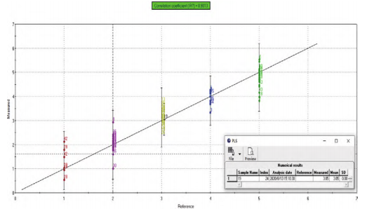 PLS模型是一種偏最小二乘回歸分析模型,使用已知感官得分的參考樣品來(lái)設(shè)置標(biāo)準(zhǔn)曲線,并根據(jù)變量的不同權(quán)重,計(jì)算各變量的回歸系數(shù),建立回歸方程,模型相關(guān)系數(shù)>0.8為合格。常用來(lái)預(yù)測(cè)感官得分和評(píng)級(jí)。將大米品質(zhì)的不同級(jí)別分別對(duì)應(yīng)1-5分,并將對(duì)應(yīng)打分賦予各個(gè)樣品,而后建立PLS模型(如圖5所示)。由圖8得出,相關(guān)系數(shù)0.9013>0.8,模型合格。將樣品19的一個(gè)平行樣在模型中投射,可得模型計(jì)算得分為3.05分,屬于優(yōu)質(zhì)三級(jí)大米,與人工評(píng)級(jí)相符,后續(xù)可嘗試用此模型對(duì)新批次樣品進(jìn)行等級(jí)評(píng)價(jià)。