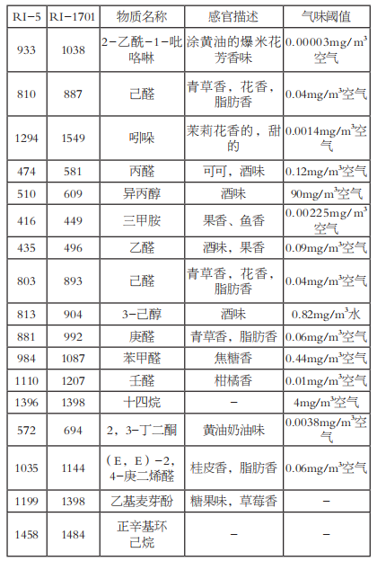 化合物的保留指數(shù)是指在某種固定相上使用正構(gòu)烷烴作為標(biāo)準(zhǔn)來(lái)衡量化合物在色譜柱上保留程度的量化值。同一種色譜柱的某一化合物的保留指數(shù)是恒定的?;衔锏谋A糁笖?shù)可經(jīng)由正構(gòu)烷烴的保留時(shí)間和化合物的保留時(shí)間計(jì)算而得到,利用兩根色譜柱不同的保留指數(shù)可達(dá)到在無(wú)標(biāo)準(zhǔn)物質(zhì)的情況下定性化合物的效果。用AroChembase數(shù)據(jù)庫(kù)對(duì)樣品中的揮發(fā)性化合物(差異色譜峰)進(jìn)行定性,可能含有的化合物見(jiàn)表2所示。閾值的大小代表了物質(zhì)氣味的強(qiáng)弱,相同含量的兩種物質(zhì),閾值越低則氣味越強(qiáng)。