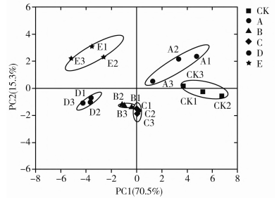由圖3可知,不同熟度樣品之間風(fēng)味具有差異,并且樣品之間的重復(fù)性較好。PC1的貢獻(xiàn)率為70.5%,PC2的貢獻(xiàn)率為15.3%,累計貢獻(xiàn)率大于85%,說明該模型具有較高的可靠性[16]。根據(jù)樣品在PCI上的距離,可將樣品分為三類:樣品CK和A為一類,樣品B和C為一類,而樣品D、E為一類,說明在較低烹飪熟度下,樣品中的揮發(fā)性風(fēng)味物質(zhì)較少,與生肉較相似:隨著烹飪熟度的增加,即在三成熟和五成熟的條件下,牛肉中的揮發(fā)性物質(zhì)較相似,并且與對照組具有明顯差異,說明烹飪熟度會影響牛肉中揮發(fā)性風(fēng)味物質(zhì)的形成;當(dāng)烹飪熟度達(dá)到七成熟以上時,牛肉中的揮發(fā)性化合物具有高度的相似性。