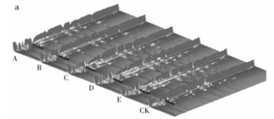 圖4是6種不同烹飪熟度的牛排揮發(fā)性風(fēng)味化合物譜圖,圖中每個點代表一種物質(zhì),淺色表示濃度較低,深色表示濃度較高,顏色越深表示濃度越大7。由圖4可知,牛排的揮發(fā)性風(fēng)味物質(zhì)能通過GC-IMS得到很好的分離,其中圖中標(biāo)記的橫線和方框處為6種不同熟度牛排中的差異性化合物,隨著牛排成熟度的增加,樣品中化合物的數(shù)量和濃度不斷增加,并且均高于對照組,其中在樣品A、B中,化合物的整體濃度較相似,即牛排介于一成熟和三成熟之間時,樣品的整體風(fēng)味輪廓較相似,而在樣品D、E中,化合物的整體風(fēng)味物質(zhì)的濃度較相似,說明牛排介于七成熟和九成熟之間時,樣品的整體輪廓較相似,與前文電子鼻結(jié)果一致。