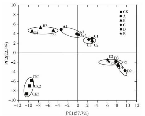 由圖7可知,樣品在PCI上的方差為57.7%,在PC2上為22.5%,累計貢獻(xiàn)率大于80%,說明模型可靠。其中,根據(jù)樣品在PCI上的距離,可將樣品分為3類:樣品C明K烹為飪一會類改,變樣牛品排A的、C整為體一風(fēng)類味,而特樣征品,并D且、E隨為著一烹類飪,說熟度的增加,樣品的風(fēng)味差異逐漸減少;當(dāng)牛排熟度介于一分和三分之間時,牛排的整體風(fēng)味輪廓較相似;而當(dāng)牛排成熟度大于七分時,樣品之間的風(fēng)味差異逐漸減小,說明當(dāng)烹飪熟度達(dá)到一定程度時,牛肉中不再形成新的揮發(fā)性化合物,該結(jié)果與前文電子鼻結(jié)果相吻合。