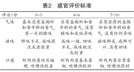 感官評價(jià)小組(8人)從鹽焗蝦的口感、滋味和氣味3個(gè)方面評定其品質(zhì),每項(xiàng)滿分為10分,感官評價(jià)總分為30分,評分標(biāo)準(zhǔn)見表1。