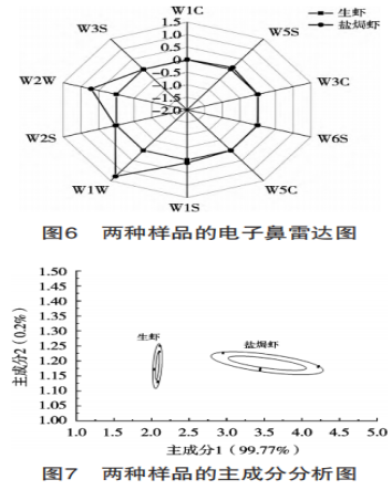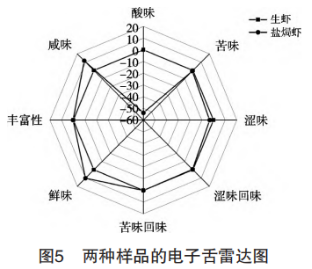 生蝦和鹽焗蝦的電子舌雷達(dá)圖如圖1所示,兩種樣品的味道特征不同。在酸味方面,生蝦遠(yuǎn)高于鹽焗蝦;在苦味、澀味和澀味回味方面,生蝦略高于鹽焗蝦;而在鮮味和咸味方面,鹽焗蝦明顯超出了生蝦。咸味是由于鹽的存在,而鮮味則可能是因?yàn)楦邷氐奶幚硎沟玫鞍踪|(zhì)與多肽的分解,從而積累鮮味氨基酸如谷氨酸、賴氨酸和甜味的氨基酸如絲氨酸、蘇氨酸、甘氨酸、丙氨酸和賴氨酸,因此這兩方面的味道非常突出,但也缺失了一些豐富性。