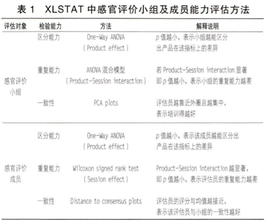 1999年,Guinard等在評(píng)價(jià)酒質(zhì)量實(shí)驗(yàn)中,用方差分析評(píng)估了啤酒評(píng)價(jià)小組是否具有一致性和重復(fù)性。Calvino等在 2005 年發(fā)表的文章中利用主成分分析法(principalcomponentanalysis)不僅分析了產(chǎn)品的感官分布,還評(píng)估了評(píng)價(jià)員個(gè)人表現(xiàn),并判斷了評(píng)價(jià)小組及成員在再培訓(xùn)上的側(cè)重點(diǎn)。徐淑臻等采用 PanelCheck軟件,通過折線圖、crelation plt和 MSEp1ot 等多種可視化圖型,探討評(píng)價(jià)小組個(gè)體的評(píng)估能力,結(jié)果表明,不同評(píng)價(jià)員對(duì)乳酸菌飲料的特定方向?qū)傩员憩F(xiàn)和重復(fù)性都有不同。