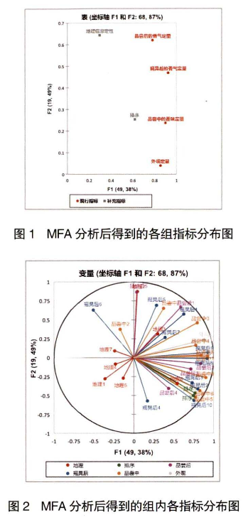 He等在報(bào)道中對(duì)腐乳進(jìn)行了多維度分析,包括由兩種感官分析方法獲得的感官數(shù)據(jù)(0DA和FP)、GC-MS靶標(biāo)揮發(fā)性化合物分析及物理性質(zhì)分析,MFA 在該文中被用于解釋這3類指標(biāo)之間的關(guān)系及物理化學(xué)指標(biāo)對(duì)感官的貢獻(xiàn)。陸龍建等運(yùn)用 MFA法對(duì)分類化學(xué)成分與感官評(píng)價(jià)結(jié)果進(jìn)行了綜合分析,并比較了采用化學(xué)成分和感官評(píng)價(jià)兩種方法剖析卷煙風(fēng)格特征時(shí)的一致性。