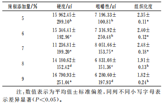 表1 不同辣椒添加量擠出物的質(zhì)構(gòu)參數(shù)