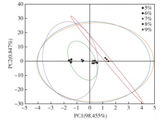 不同樣品酸味、甜味、苦味、咸味、鮮味5個滋味的排序見圖3,電子舌傳感器相對強(qiáng)度值存在明顯差異,表明電子舌測試可有效地區(qū)分不同樣品的滋味。5個樣品在ANS傳感器上的響應(yīng)強(qiáng)度無明顯差異,在SCS、PKS、NMS、CTS、CPS、AHS傳感器上的響應(yīng)強(qiáng)度存在差異,不同樣品的酸味、咸味、鮮味相對強(qiáng)度值從小到大的順序為酸味排序:6%<8%<9%<7%<5%,咸味排序:6%<9%<8%<7%<5%,鮮味排序:6%<8%<9%<7%<5%。