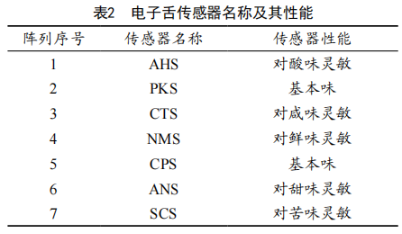米飯與水按照1:15的比例混勻,浸泡10 min,取80 mL待測(cè)液放于電子舌專用杯中檢測(cè)。電子舌傳感器名稱及其性能描述見(jiàn)表2。