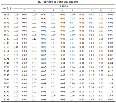 通過(guò)電子眼檢測(cè),占比在1%以上的特征色號(hào)有22個(gè)。其中,隨著苦蕎米添加量的增加,占比在增大的特征色號(hào)有13個(gè),如:1619、1875、1876、1891、1892、1893、2147、2148、2163、2164、2165、2421、2437;隨著苦蕎米添加量的增加占比在減少的特征色號(hào)有9個(gè),如:2709、2982、2983、2984、3000、3255、3256、3257、3273。為驗(yàn)證電子眼采集圖像的穩(wěn)定性,以確保實(shí)驗(yàn)數(shù)據(jù)的可靠性,計(jì)算樣本的相對(duì)標(biāo)準(zhǔn)偏差(Relative standard deviation, RSD),結(jié)果如表4所示。樣本特征色號(hào)RSD值均小于5%,表明電子眼采集的苦蕎米飯色澤數(shù)據(jù)具有良好的重現(xiàn)性,可滿足后續(xù)分析。