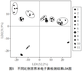 經(jīng)電子鼻測(cè)定的線性判別分析如圖2所示。由圖可知,LD1的貢獻(xiàn)率為52.2%,LD2的貢獻(xiàn)率為31.9%,其累計(jì)貢獻(xiàn)率為84.1%,能夠反映樣品中的大部分氣味信息。1、2、11號(hào)樣本與其余樣本距離較遠(yuǎn),表明了1、2、11號(hào)樣本與其余樣本之間的差異較大。6~10號(hào)樣本距離較近,存在部分重疊現(xiàn)象,說(shuō)明這幾組樣本氣味相似,并且隨著苦蕎米添加量的增大,樣本呈現(xiàn)出從左向右依次移動(dòng)的趨勢(shì)。1、2號(hào)樣本米飯的香味較重、苦蕎的香味較淡,苦蕎香味從3號(hào)樣本開(kāi)始逐漸明顯,11號(hào)樣本苦蕎味過(guò)重。