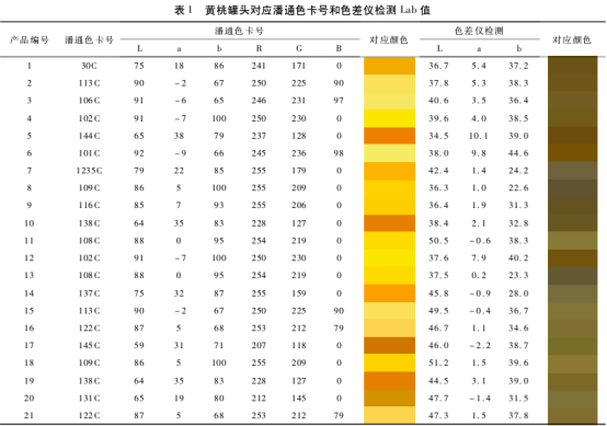 為了減少其他因素的干擾如品牌、價格、廣告、經(jīng)驗等方面的影響,本實驗決定采用雙盲法進行檢驗。所有的樣品都用3個隨機的數(shù)字進行編碼,檢驗樣品也隨機化。在進行試驗之前罐頭要先打開5min,再將桃片放在白色瓷盤上。由訓(xùn)練型評價員以潘通色卡為參比物,尋找和黃桃罐頭相對應(yīng)的色卡,記錄下其Lab值和RGB值,然后再由訓(xùn)練型評價員根據(jù)經(jīng)驗,按照金黃色、黃色、淺黃色、暗黃色將其分為四類。