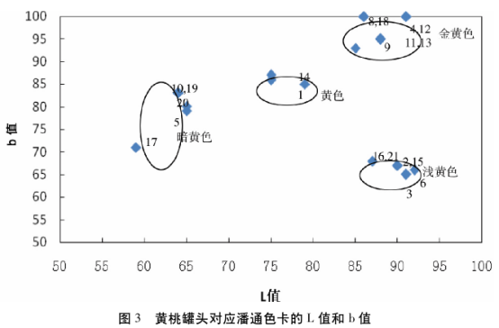 黃桃罐頭對應(yīng)潘通色卡L值和b值分布見圖3,可以看出金黃色b值最大在90~100之間;淺黃色b值最小,在60~70之間,黃色b值在80~90之間,暗黃色b值在70~80之間。金黃色L值范圍80~90之間,黃色L值在70~80之間,淺黃色L值最大在80~90之間,暗黃色L值在60~70之間。
