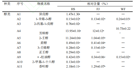 醇類在FJ、HS以及WF樣品中相對含量分別為26.36%、60.25%、13.32%。其中1-辛烯-3-醇、芳樟醇、α-松油醇為三組樣品共有物質(zhì),芳樟醇是三組樣品中相對含量最高的揮發(fā)性化合物,分別為FJ組(12%)、HS組(13.95%)、WF組(10.73%)。醛類物質(zhì)在FJ、HS以及WF樣品中相對含量為2.16%、1.43%、21.09%。并且WF組中醇類物質(zhì)相對顯著高于(P<0.05)其它兩組樣品。苯甲醛、正辛醛、苯乙醛、壬醛作為三組樣品共有物質(zhì)。酸類物質(zhì)樣品FJ(1.21%)、HS(0.63%)和WF(1.53%)中相對含量并不太高,且在WF中相對含量顯著高于(P<0.05)其他兩組。酯類物質(zhì)主要在WF組樣品中檢出,相對含量為57.39%,顯著高于(P<0.05)FJ組(7.72%)與HS(1.45%)組。酮類物質(zhì)在FJ和HS樣品中相對含量分別為60.24%和21.72%,而WF樣品中則并未檢測到此類物質(zhì)。其中2-壬酮為FJ于HS樣品中共有且相對含量最高的物質(zhì),可以為發(fā)酵后的濃汁貢獻(xiàn)花香與果香。其他揮發(fā)性物質(zhì)在三組樣品中共檢出8種,其中3,5-二叔丁基苯酚為HS、FJ、WF樣品共有揮發(fā)性化合物。