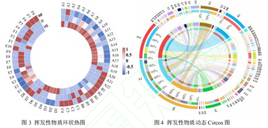 聚類熱圖與動態(tài)Circos圖都可以結(jié)合大量數(shù)據(jù),以漸進(jìn)色帶和對應(yīng)顏色標(biāo)簽的占比形式共同將檢測得到的各揮發(fā)性化合物與三組樣品的相關(guān)性直觀的展現(xiàn)出來。結(jié)合圖3、圖4分析可知,在HS樣品中醇類(A)物質(zhì)相對含量及種類較多,其中包括芳樟醇(A4)、2-壬醇(A5)和2-十二烷醇(A12)等物質(zhì)。FJ樣品中酮類(E)物質(zhì)相對含量與種類相較另外兩組樣品較多,主要包括:2-壬酮(E3)、2-十一酮(E4)等物質(zhì)。WF樣品中醛類(B)與酸類(C)物質(zhì)占據(jù)主導(dǎo),其中芳樟醇(A4)、苯乙醛(B3)等物質(zhì)為濃汁本身提供了堅(jiān)果香氣與櫻桃香氣,并且酸類在其發(fā)酵過程中為其他風(fēng)味物質(zhì)的形成提供了前體物質(zhì)。這一結(jié)果與表1及PCA分析一致。