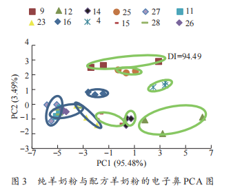 電子鼻測(cè)定純羊奶粉及配方羊奶粉的PCA結(jié)果見(jiàn)圖3,缺陷率(DI)為94.49,說(shuō)明PCA法整體區(qū)分效果很好,其主成分1(PC1)的方差貢獻(xiàn)率為95.48%,主成分2(PC2)的方差貢獻(xiàn)率為3.49%,累計(jì)貢獻(xiàn)率為98.97%,基本可以代表樣品全部信息。樣品間的距離越近說(shuō)明其品質(zhì)特性越相似,即距離可以量化樣品間的品質(zhì)差異。根據(jù)PCA結(jié)果將奶粉歸為2個(gè)區(qū)域,溯源到奶粉種類(lèi)時(shí)發(fā)現(xiàn)前者為配方羊奶粉,后者為純羊奶粉,純羊奶粉和配方羊奶粉距離較遠(yuǎn),區(qū)分度較好。