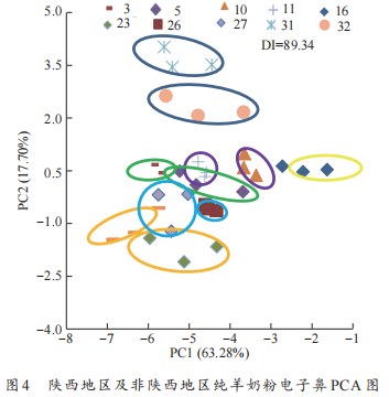 電子鼻測(cè)定陜西地區(qū)及非陜西地區(qū)純羊奶粉的PCA結(jié)果見(jiàn)圖4。根據(jù)PCA結(jié)果可以看出,國(guó)外地區(qū)與國(guó)內(nèi)地區(qū)(陜西地區(qū)及國(guó)內(nèi)非陜西地區(qū))純羊奶粉數(shù)據(jù)點(diǎn)相距較遠(yuǎn),得到了良好區(qū)分。此外,陜西地區(qū)各市純羊奶粉比較集中,表明其含有較多相似的羊奶粉揮發(fā)性物質(zhì),其中咸陽(yáng)市與其他3市相距較遠(yuǎn),說(shuō)明咸陽(yáng)市純羊奶粉與其他3市可得到較好區(qū)分,這與陜西地區(qū)不同城市純羊奶粉雷達(dá)圖結(jié)果一致。上述結(jié)果表明,僅利用電子鼻技術(shù)的主成分分析法無(wú)法完全區(qū)分陜西地區(qū)各市之間與國(guó)內(nèi)非陜西地區(qū)之間的差異。